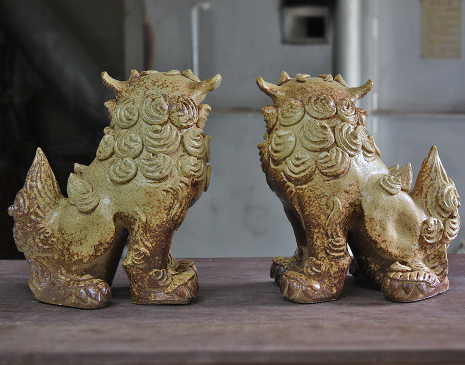 その先輩が制作するシーサーですが、写真のように色がとても特徴的な作品です。灰釉を施しているのですが、灰釉とは、釉薬(ゆうやく) その他にも「うわぐすり」と呼ばれる、ガラス質の材料に草木を燃やして作られる灰をかけ合わせて作られます。 草木も様々で、また配合する分量やその時々の温度や湿度でもたくさんの色があります。 実は宮城さんが用いる釉薬は、宮城家に伝わる秘伝の製法なのです。 |