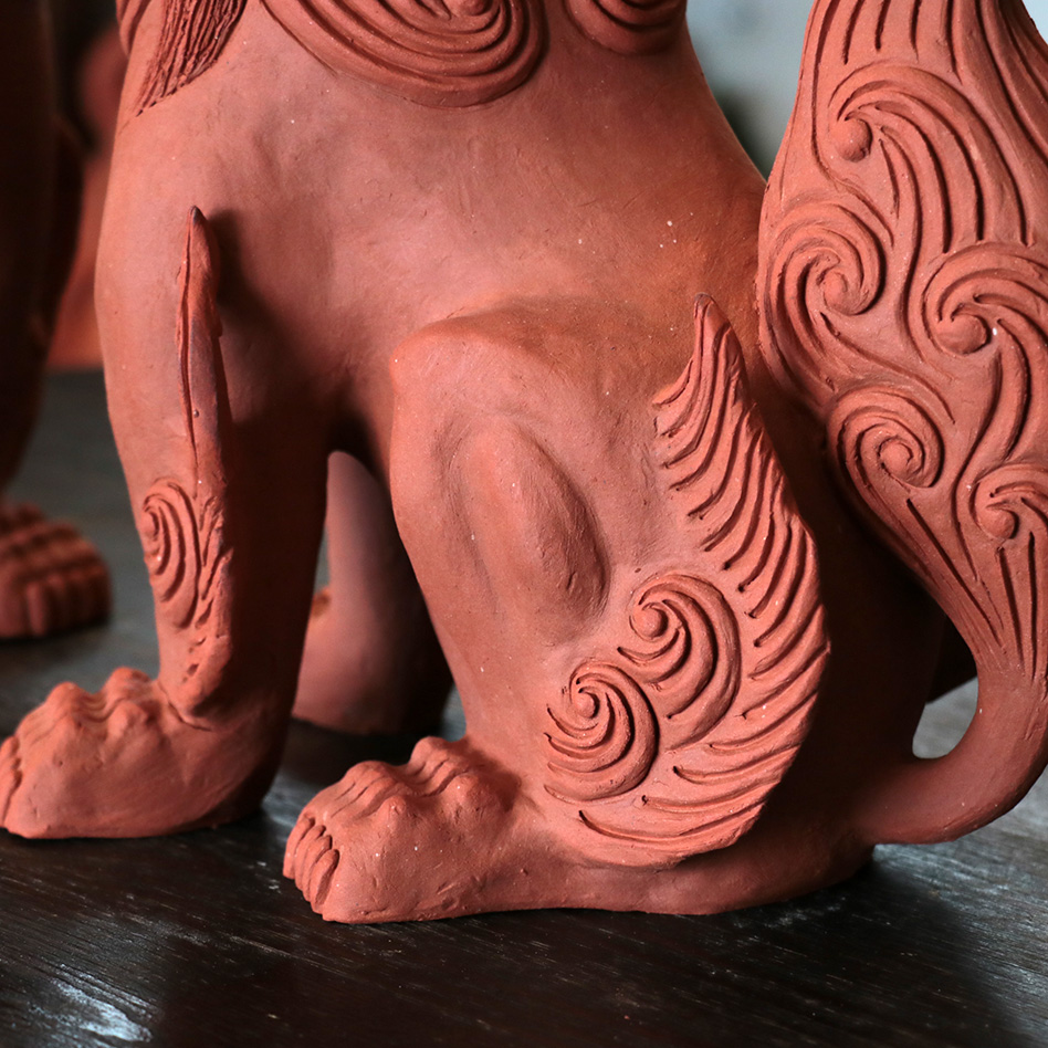父の作品には、父の哲学観である「白毫」(びゃくごう)という神としての目覚めが最後の最後に宿ることで、獅子が荒ぶる獣から神聖な存在へと変わる概念が込められています。 この守り神としての誕生は、魔除け獅子としての役割を果たす重要な要素だと強く信じています。 父は自分の名前を作品に刻むことはありません。それは父の謙虚さという事よりも作品自体が守護神となることを信頼している証でもあります。 それによって、作品は個人の一時的な存在ではなく、永遠の存在となり、多くの人々の慶びと守りとなると考えています。 |
