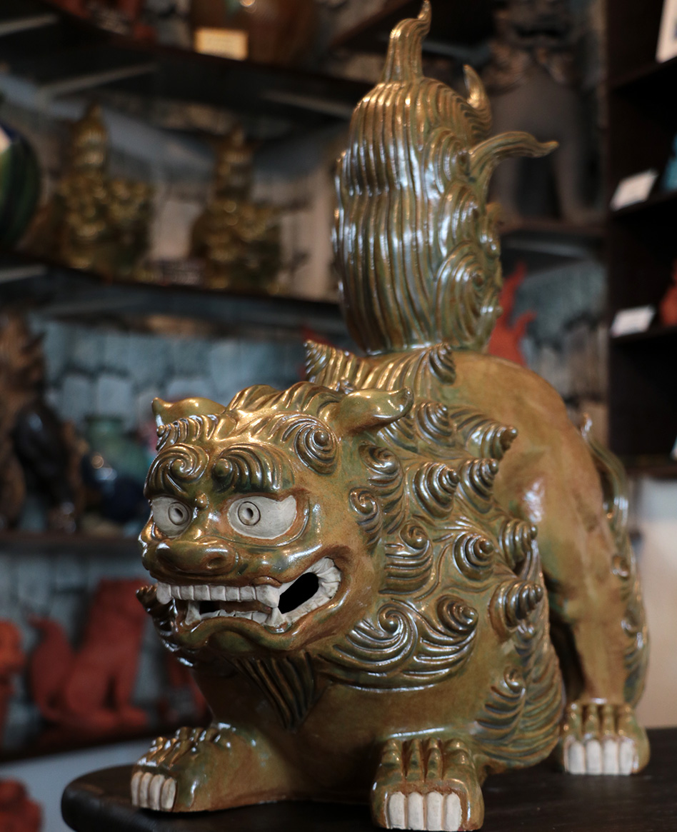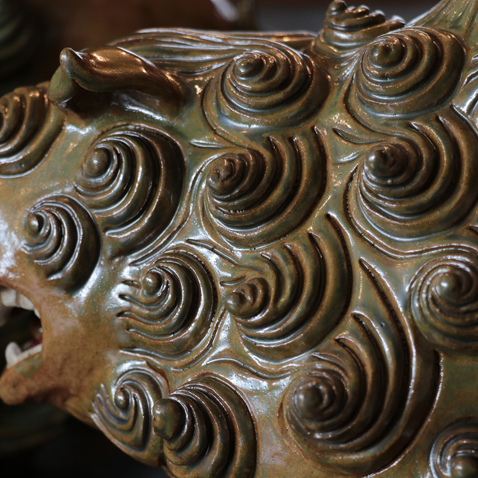 父の作品「オーグスヤーシーサー」をご紹介いたします。この作品は、父が成型し、私が釉薬を施した親子合作です。 父は新垣瓦工場の二代目として瓦、花鉢、レンガを制作しながら、屋根シーサーを手がけてきました。 今回の作品「オーグスヤーシーサー」は、私たちにとっては新しい色になるのですが、沖縄伝統の色になっています。 |