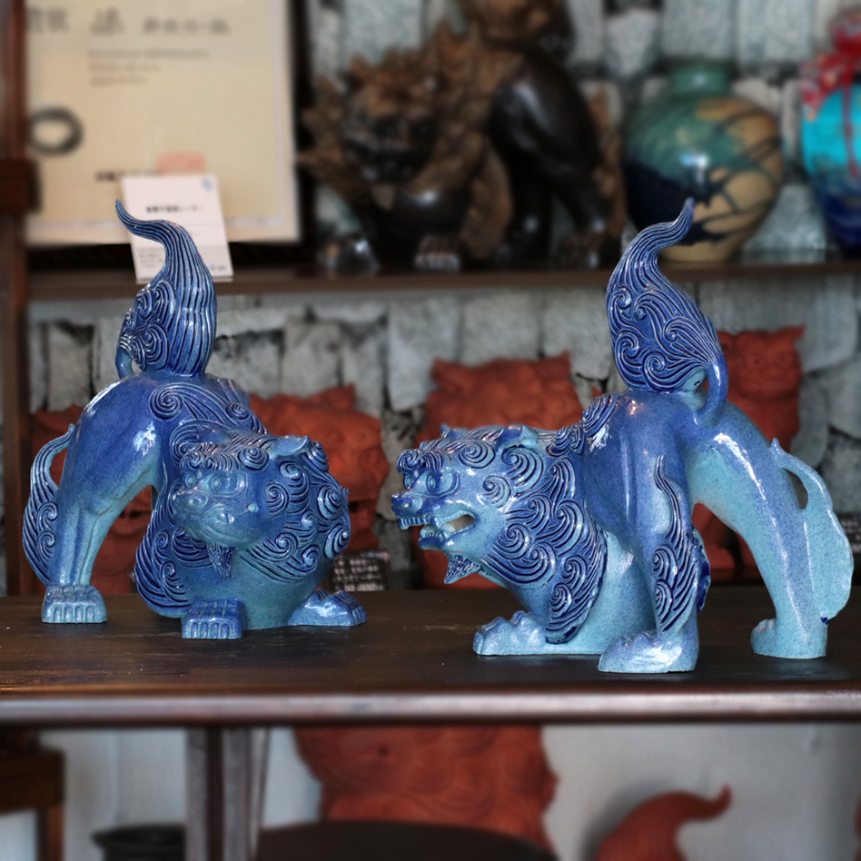 このシーサーは、父・信一が丹念に彫り込んだ毛並みに、私が施釉した鮮やかな青が、命を吹き込んだ作品です。 形は「尻上がり」。 沖縄の文化から生まれたこの一対は、「ただの守り神ではなく、願いを乗せて未来へ向かう“青い魂”」です。 |
