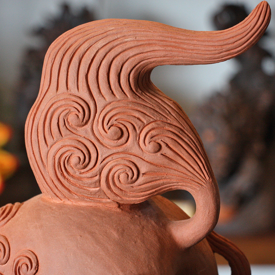 細部に宿る父の信念が好きです。シンプルだけども、何度も何度も丹念に線を入れたり形を整えたり、父のモノ作りは遅いですが、 その遅さは守護神として魔除けとしての作品を制作しているのだという気迫と責任感だと思います。 その気迫と信念を感じて頂けたら嬉しいです。 |