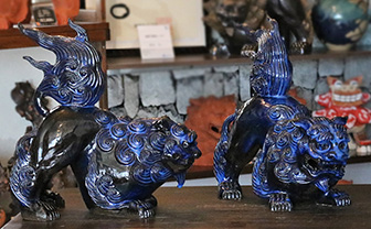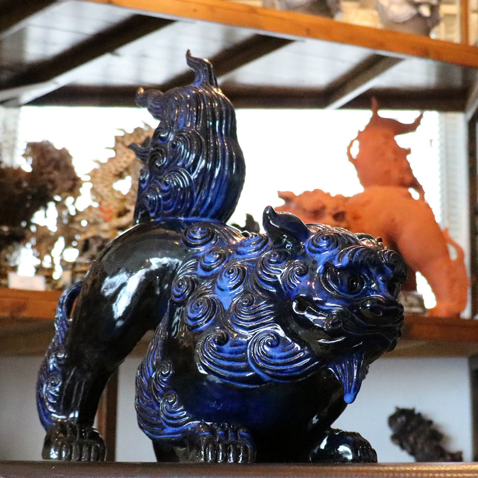 父の作品「深海シーサー」をご紹介いたします。この作品は、父が成型し、私が釉薬を施した親子合作です。 今回の作品「深海シーサー」は、沖縄の美しい「ちゅら海」の透明で明るい水面からは想像もつかない深海の世界を表現しています。 また、青の洞窟のような神秘的な色合いを持つこのシーサーは、洞窟内で照らされた光が海面に反射する様子を再現しています。 |