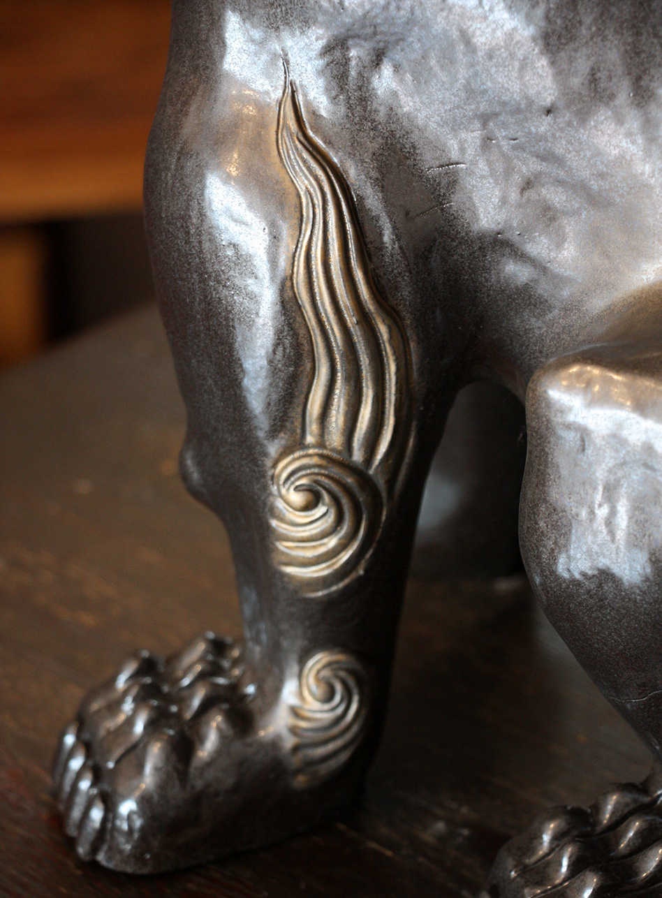 細部に宿る父の信念が好きです。シンプルだけども、何度も何度も丹念に線を入れたり形を整えたり、父のモノ作りは遅いですが、 その遅さは守護神として魔除けとしての作品を制作しているのだという気迫と責任感だと思います。 その気迫と信念を感じて頂けたら嬉しいです。 |