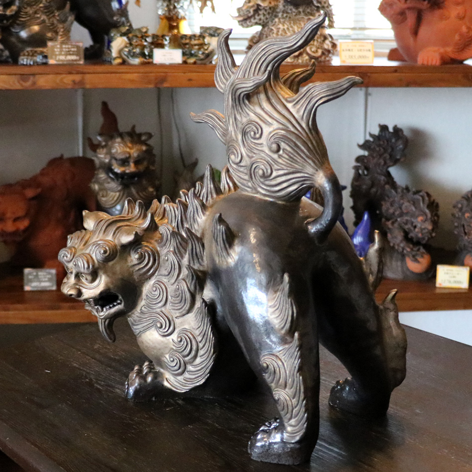 この「金獅子」のペアは、レキオス時代の琉球王国の壮麗さを今に伝える作品です! 金ラスター釉薬で煌びやかに仕上げられたシーサーは、王朝が経験した繁栄の象徴であり、家庭に幸福と富をもたらす縁起の良い 見る者を圧倒するその存在感と、各角度から観察できる緻密な装飾は、父の技術の粋を集めたものです。 また、同じ釉薬をしようしてシーサーの胴体から足の部分は黒いメタリックに仕上げています。これで一層金が映えているように思います。 同じ金ラスター釉なのに、毛並みと胴体の違い。これが焼き物の奥深さと面白さ、そして難しさです。 この作品は1240度の高温で焼きしめました。叩くとカキーンと良い音が響きます。 |
