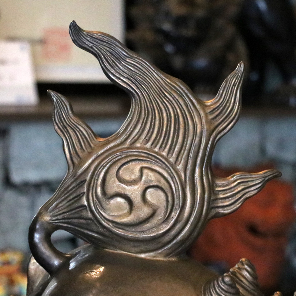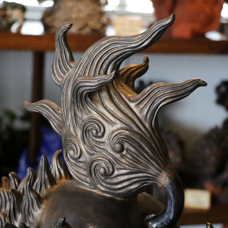 さらに!この作品は「風神・雷神」シリーズとなっています。 風神雷神図屏風は、日本の伝統や歴史に深く刻まれていて、俵屋宗達が描いた風神・雷神は、何世紀にも渡って私たちの魂に その歴史ある「風神・雷神」をコンセプトにして制作した父の作品なのですが、シーサーという守り神を崩さず風神様と この一点に置いて父が思慮しながら形にしました。 このディテールの背後には、風神・雷神の持つ無限の力と奥行きを感じさせる意識が込められています。 この作品が多くの人々に「傑作」と評価されるように、シリーズ化していきます。今回の作品はその第三弾となります。 |